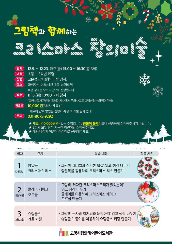 [로컬세계 = 이영원 기자]경기 고양특례시 화정어린이도서관이 크리스마스를 맞아 초등학교 1~3학년을 대상으로 다음달 9일부터 23일까지 매주 금요일 '그림책과 함께하는 크리스마스 창의미술'을 운영한다.