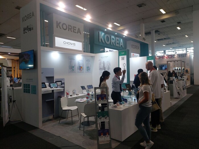 ▲ 미용의료전자기기 전문업체인 초위스 관계자가 현지 바이어들에게 안내하고 있다. 용인시 제공 |