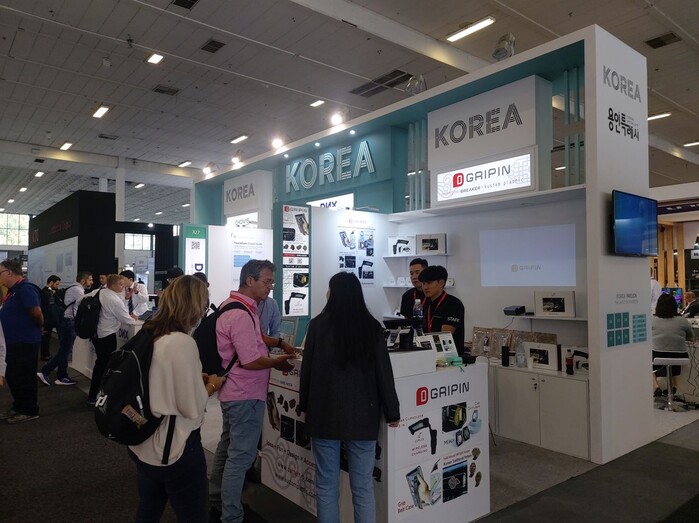 ▲ 차량용 스마트폰 거치대를 생산하는 그립인 부스에서 현지 바이어들이 둘러보고 있는 모습이다. |