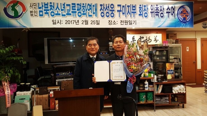 ▲남북청소년교류평화연대 경북 구미시협의회 장성웅 신임회장(오른쪽)이 윤정규 사무총장으로부터 위촉장을 받고 있다. |