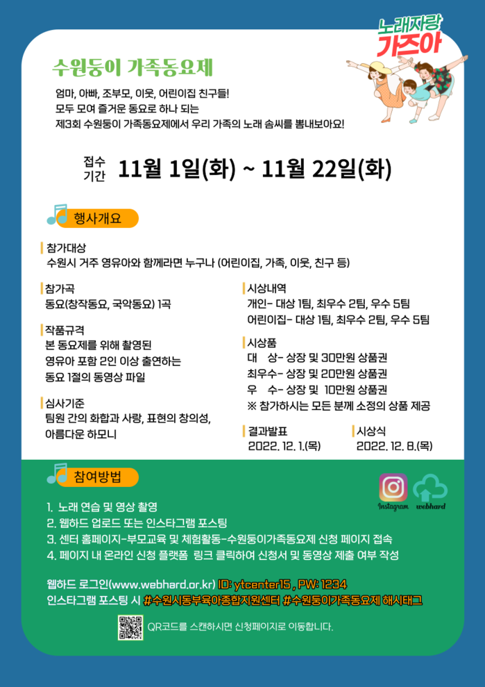 동영상을 개인 인스타그램에 포스팅하거나 웹하드 업로드 후 수원시동부육아종합지원센터 홈페이지 ‘가정양육지원→부모교육 및 체험활동→교육신청’에 게시된 ‘제3회 수원둥이 가족동요제 UCC 공모전’ 페이지에서 온라인 신청서(동영상 제출 여부 등 작성)를 제출하면 된다.