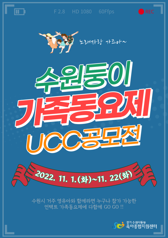 [로컬세계=김병민 기자]경기수원시동부육아종합지원센터가 22일 오후 11시까지 ‘제3회 수원둥이 가족동요제 UCC(동영상) 공모전’ 신청을 받는다.