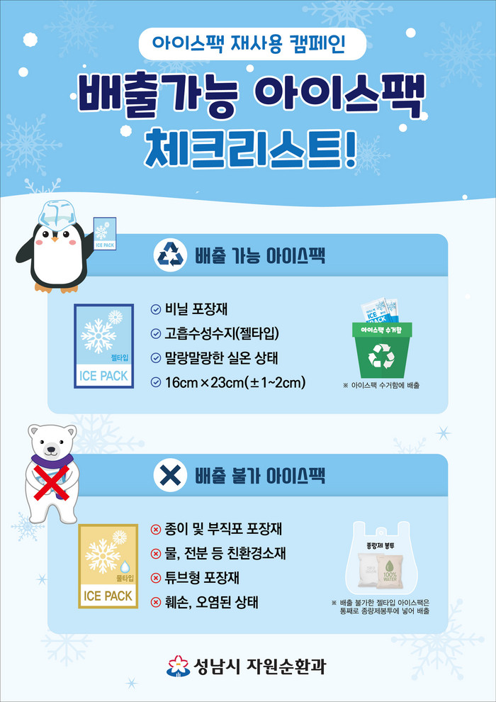 성남시 자원순환과 관계자는 “가정에서 버려지는 아이스팩을 모아 배출할 수 있도록 수거함을 확대 설치하고 제공 업체도 늘렸다”면서 “환경오염 예방과 생활 쓰레기 감축에 협조해 달라”고 말했다.