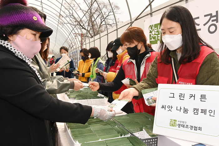 오기영 수원시 공원녹지사업소장, 김현광 팔달구청장을 비롯한 수원시 직원들과 (사)생태조경협회 회원들은 그린커튼 사업을 확산하기 위해 직접 채종한 나팔꽃·흑편두·수세미·청자박 등 식물의 씨앗을 종이봉투에 담아 시민들에게 배부했다(봉투당 6종 63립).
