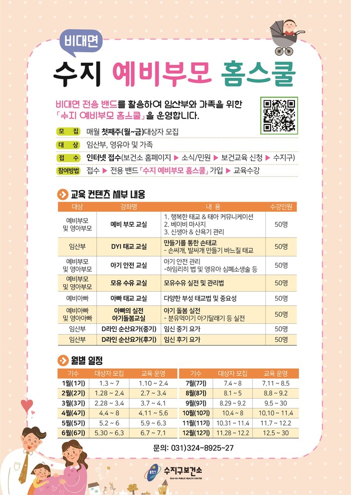 수지 예비부모 홈스쿨은 ▲예비부모교실 ▲DIY 태교교실 ▲아기안전교실 ▲모유수유교실 ▲아빠태교교실 ▲아빠의 실전 아기돌봄교실 ▲D라인 순산요가(중기) ▲D라인 순산요가(말기) 등 8개 강좌로 구성됐다. 1인당 최대 8개까지 수강할 수 있다.