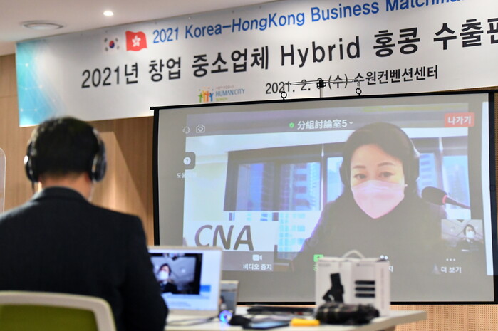 ▲수원시가 지난해 2월 추진한 비대면 수출개척단 사업으로 지역 내 창업·중소업체와 홍콩 바이어를 연결해 수출 상담을 진행하고 있다. |