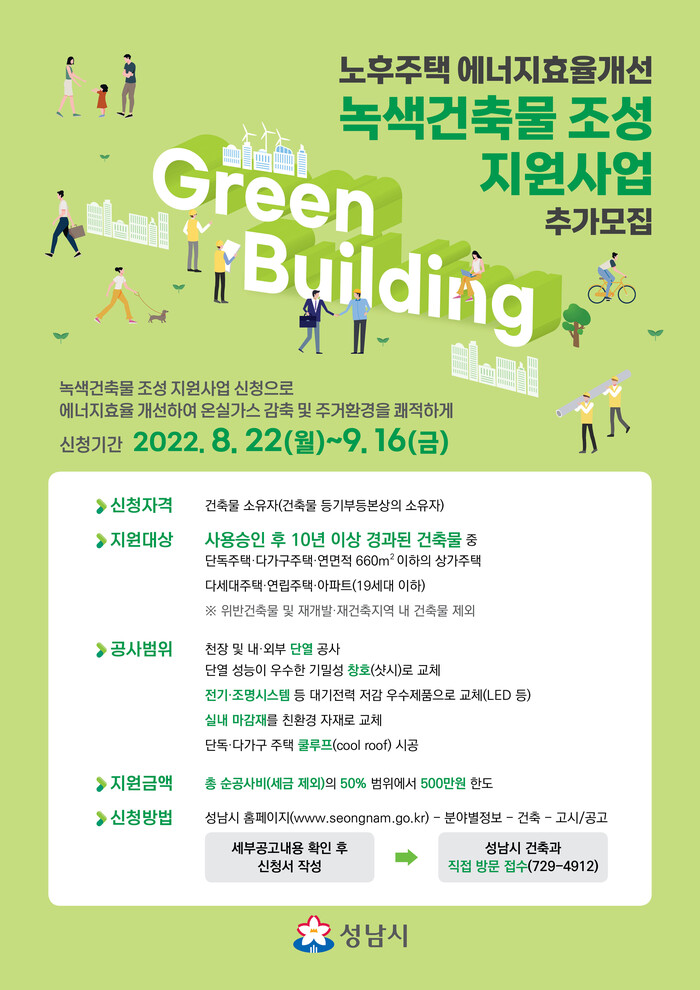 [로컬세계=김병민 기자]경기 성남시는 오는 9월 16일까지 녹색건축물 조성 지원 사업 대상자를 추가 모집한다.