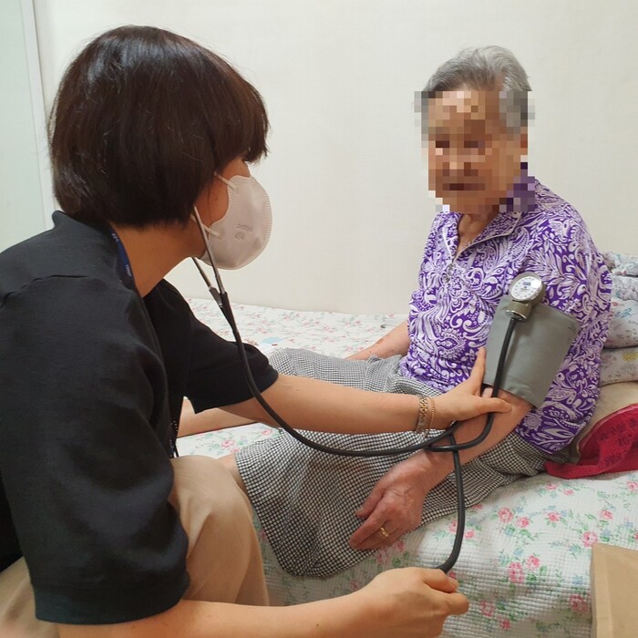 ▲보건소 관계자가 건강 취약계층 가구를 방문해 혈압을 측정하고 있는 모습. 용인시 제공 |