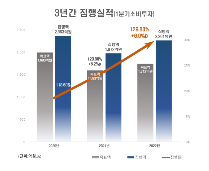 소비 분야 예산 4458억원 중 1분기에 인건비 729억원·물건비 650억원 등 1379억원(30.9%)를 집행했고, 투자 분야(예산 5267억원)는 882억원(16.7%)를 집행했다.