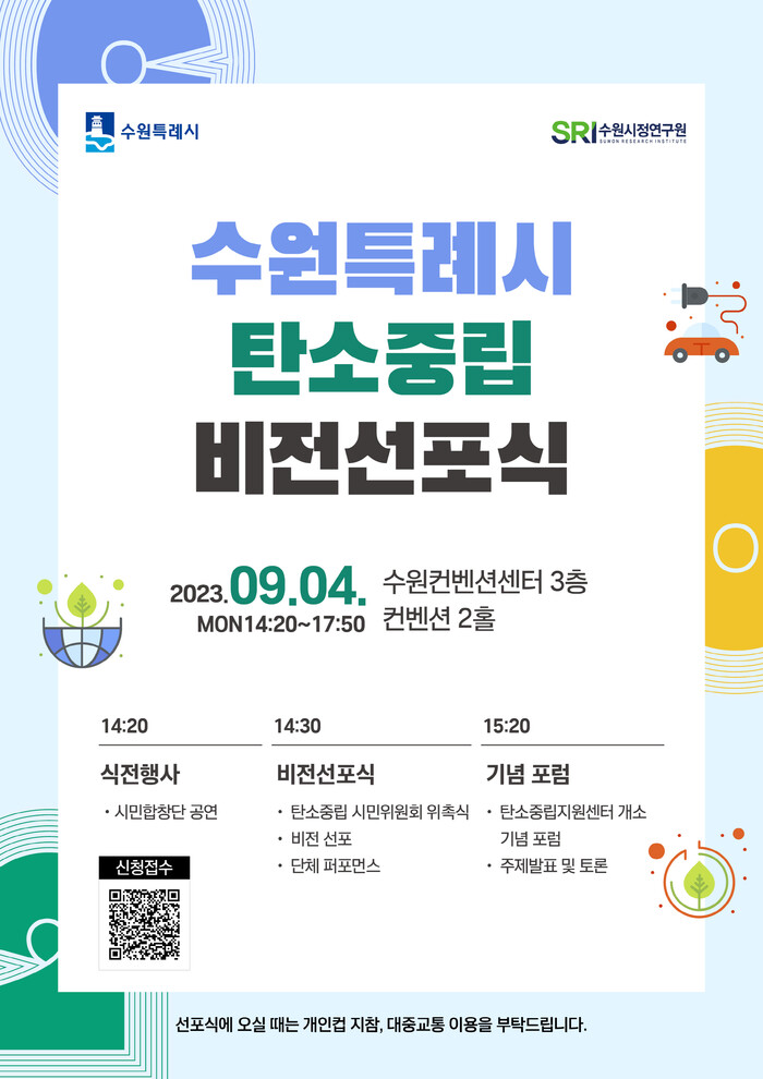 탄소중립 비전선포식은 9월 4일 오후 2시 30분 수원컨벤션센터 3층 컨벤션 2홀에서 열린다.