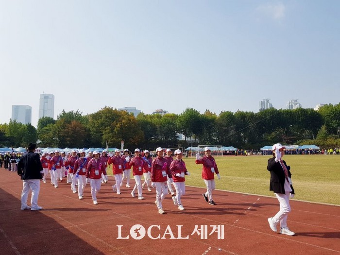 ▲지난 29일 오전 서울 잠실종합운동장 보조경기장에서 열린 '제38회 재경고흥군민 한마음 체육대회'에서 선수단이 입장식을 하고 있다. 김재덕 기자. |