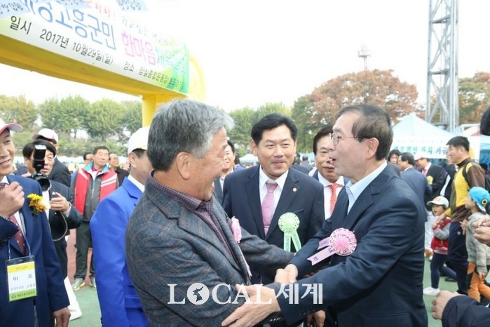 ▲제38회 재경고흥군민 한마음 체육대회를 축하해 주기 위해 참석한 박원순 서울시장을박병종 고흥군수가 반갑게 맞이하며 악수를 나누고 있다. 두사람은 오랜동안 좋은 인연으로 지내오고 있다. |