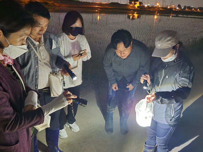 ▲수원시와 국립생태원 관계자들이 야간 모니터링을 하고 있다. |