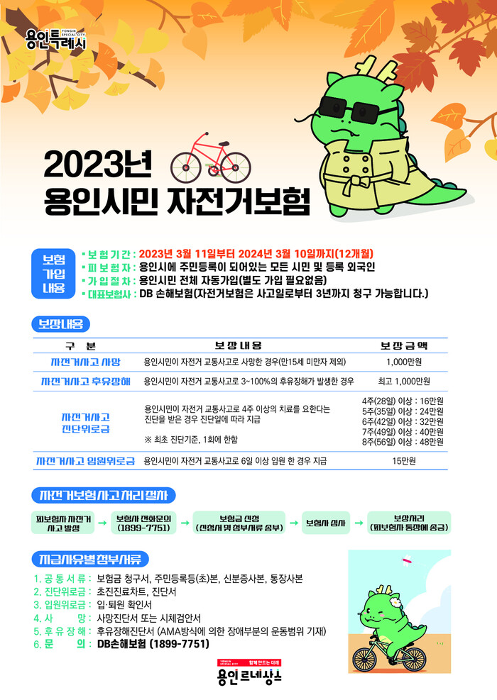 [로컬세계=김병민 기자] 110만 용인시민 누구나 자전거를 타다 상해를 입었을 때 최대 1000만원의 보상금을 받을 수 있다.
