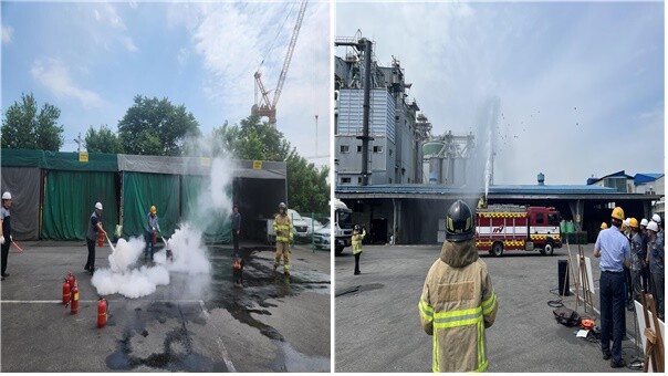 ▲ 화재진압·대피훈련 현장사진. 왼쪽부터 소화기 초기진압, 소방차 방사훈련. 농협사료 제공 |