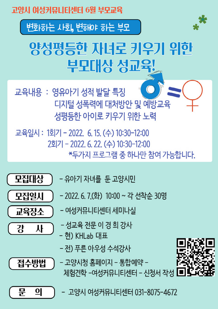 [로컬세계 이영원 기자]경기 고양시 여성커뮤니티센터에서 오는 6월 15일과 22일 2회에 걸쳐 ‘양성 평등한 자녀로 키우기 위한 부모대상 성교육’을 진행한다.
