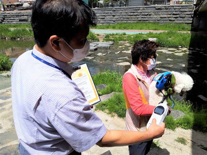 ▲구 관계자가 경안천 산책로에서 동물등록 여부를 확인하고 있는 모습. |