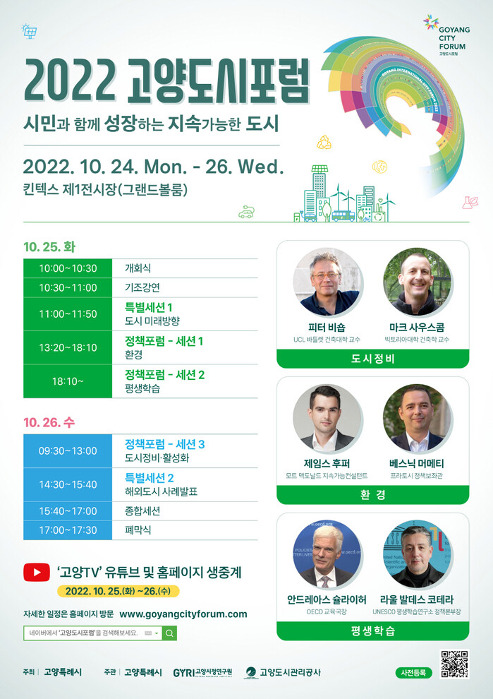 2022고양도시포럼에 참석하는 연사들은 ▲UCL Battlet school 건축학 교수 피터 비숍 ▲뉴질랜드 빅토리아 대학 건축학 교수 마크 사우스콤 ▲OECD교육국장 안드레아스 슐라이허 ▲지구환경과학 박사이자 방송인 제임스 후퍼 등이다.