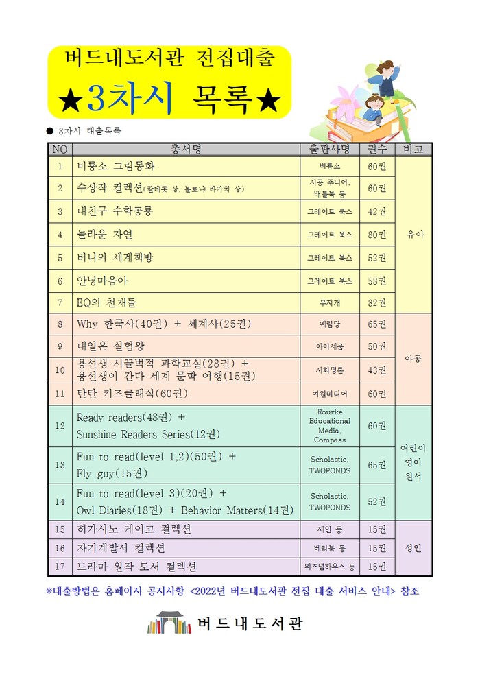 대출할 수 있는 전집은 ▲비룡소 그림동화(60권) ▲내친구 수학공룡(42권) ▲안녕 마음아(58권) ▲Why 한국사·세계사(총 65권) ▲내일은 실험왕(50권) ▲탄탄 키즈클래식(60권) 용선생 시끌벅적 과학교실·용선생이 간다 세계 문학 여행(사회평론, 43권) ▲Step into reading Level 1+2(스텝 인우 리딩 레벨 1+2, Random House, 70권) ▲Ready readers+Sunshine(레디 리더스+선샤인 리더스, 60권) ▲Fun to read level 1·2+Fly guy(펀 투 리드 레벨 1·2+플라이 가이, 65권) ▲Owl Diaries+Behavior Matters(아울 다이어리즈, 비헤이버 매터스, 52권) 등이다.