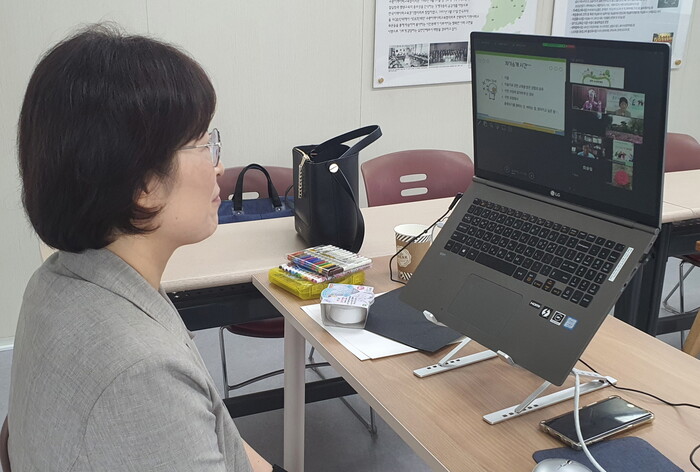 ▲김순옥 수원지역사회교육협의회 강사가 화상회의 프로그램을 활용해 강연하고 있다. 수원시 제공 |