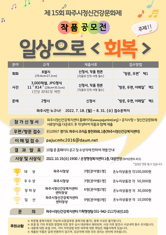 이번 작품공모전의 주제는 ‘일상으로 <회복>’으로, 회화(미술), 문예(2행시), 사진 총 3분야를 공모하며, 파주시민 누구나 참여 가능하다.
