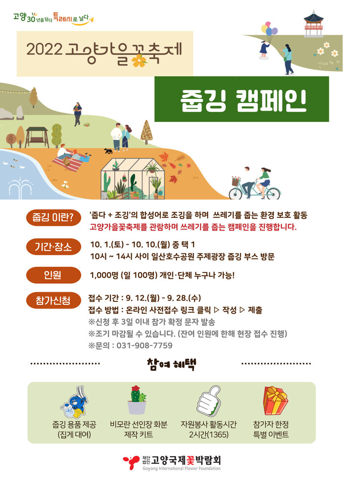 [로컬세계 = 이영원 기자](재)고양국제꽃박람회(이사장 이동환)는 다은달 1일부터 10일까지 개최되는 2022고양가을꽃축제에서 진행되는 줍깅 캠페인의 참가자를 모집한다고 16일 밝혔다.