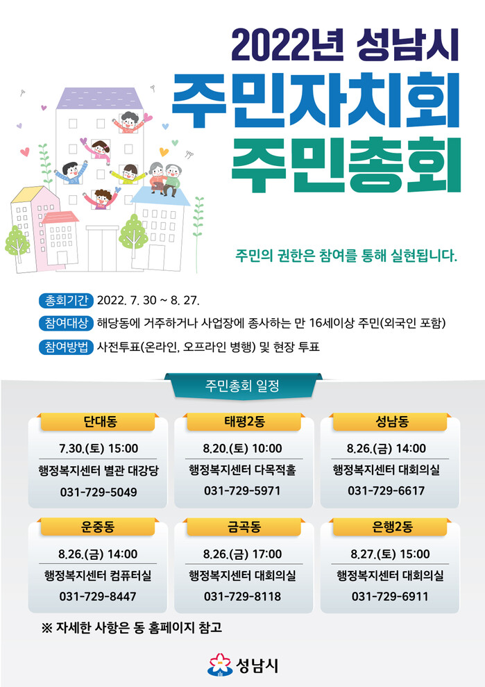 총회가 열리는 곳은 주민자치회 시범동으로 선정한 단대동(7.30), 태평2동(8.20), 성남동(8.26), 운중동(8.26), 금곡동(8.26), 은행2동(8.27)이다.