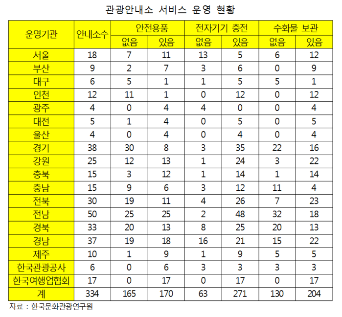 관광객이 가장 많은 수도권은 비치하지 않은 곳이 10곳 중 7 곳에 달했다. 전국 안내소 10곳 중 8곳에서 휴대전화 충전서비스를 제공하지만, 서울지역 안내소 10곳 중 7곳은 이 서비스를 제공하지 않았다.