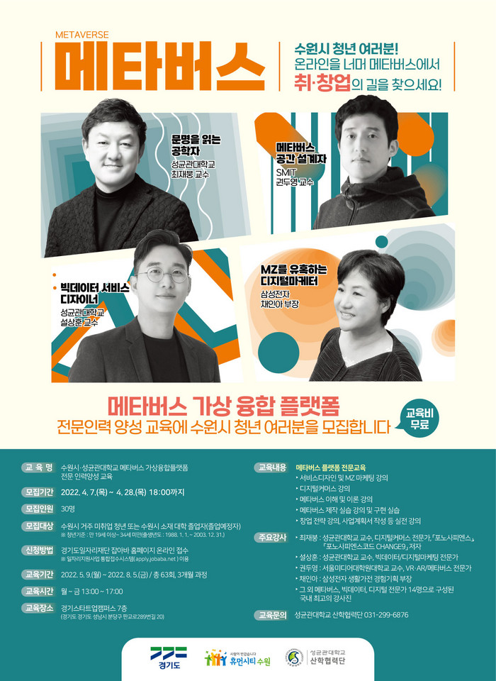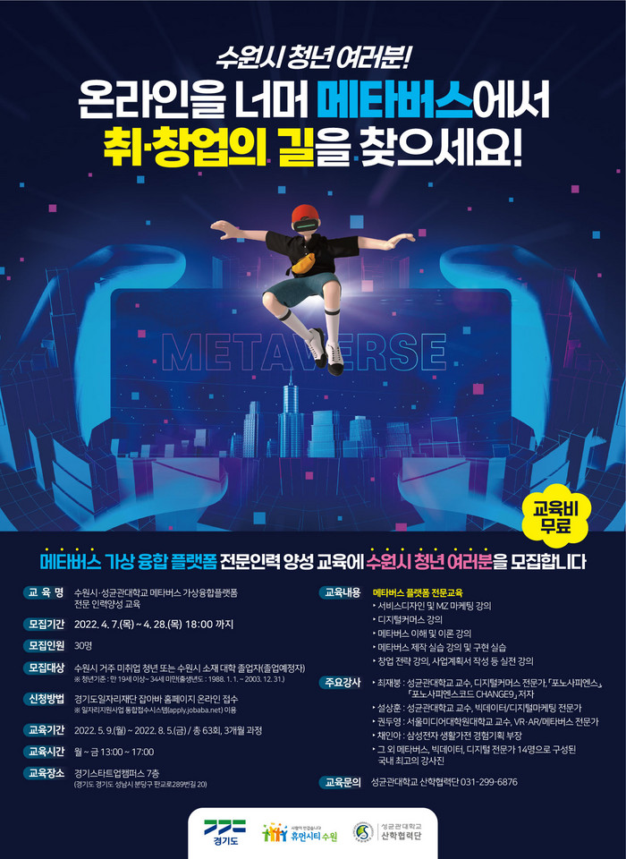 [로컬세계 김병민 기자]경기 수원시가 성균관대학교와 협력해 진행하는 ‘메타버스 가상융합플랫폼 전문인력 양성 지원사업’에 참여할 청년을 모집한다.