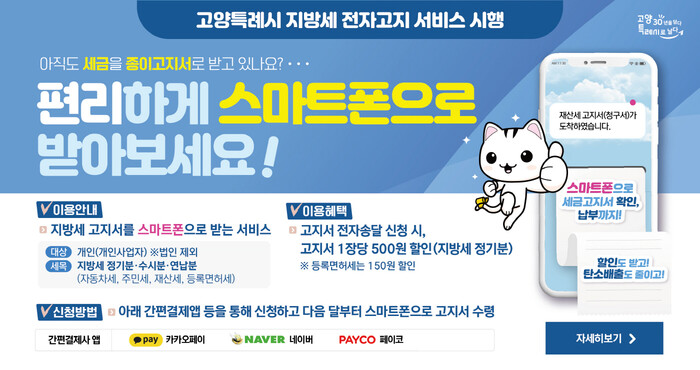 [로컬세계 = 이영원 기자]경기 고양시가 고지서를 받지 못 하거나 바쁜 일상 탓에 지방세 납부를 잊는 일을 예방하기 위해 지방세 전자송달 서비스를 시행하고 있다.