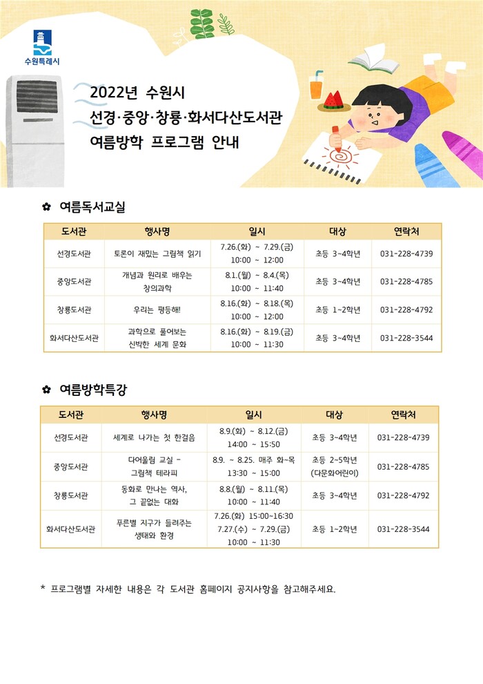 이밖에 여름 독서교실으로 ▲토론이 재밌는 그림책 읽기(선경도서관, 7월 26~29일) ▲개념과 원리로 배우는 창의과학(중앙도서관, 8월 1~4일), 여름방학 특강으로 ▲푸른별 지구가 들려주는 생태와 환경(화서다산도서관, 7월 26~29일) ▲동화로 만나는 역사, 그 끝없는 대화(창룡도서관, 8월 8~11일) 등 프로그램이 운영된다.