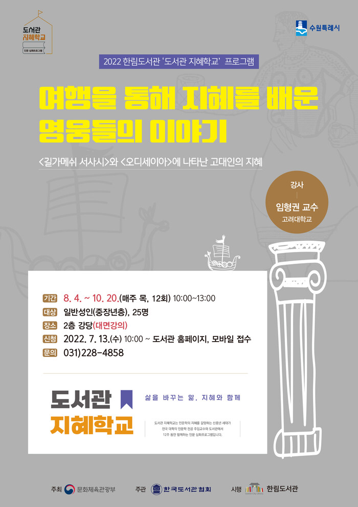 [로컬세계=김병민 기자]경기 수원시 한림도서관이 ‘여행을 통해 지혜를 배운 영웅들의 이야기’ 강좌에 참여할 수강생 25명을 13일 오전 10시부터 선착순으로 모집한다.
