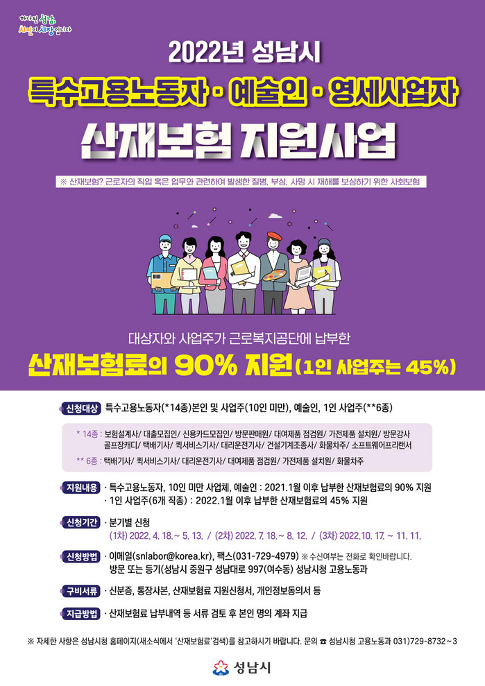 대상자는 산재보험료 지원신청서, 본인 명의 통장 사본 등의 서류를 성남시청 고용노동과 이메일이나 팩스, 등기우편으로 보내면 된다. 시청 7층 고용노동과 사무실을 방문 접수해도 된다.