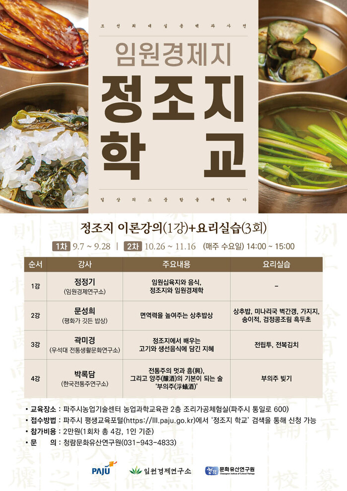 ‘정조지 학교’는 파주 장단 출신 대학자 풍석 서유구 선생의 실용백과사전인 『임원경제지』를 대중들에게 널리 알리고자 기획한 2022 임원경제지 학교의 일환으로, 강의와 요리실습 4강으로 구성되며 최고의 정조지 요리 연구자들이 참여한다.