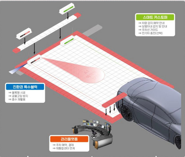 스마트 카스토퍼는 차량 감지, 보행자 감지·안내, 주차선 가이드, 전기차 충전 등 기능이 있다. 주차장에는 투수(透水) 저류 블록을 설치해 빗물이 순환되는 친환경 시스템을 만든다.