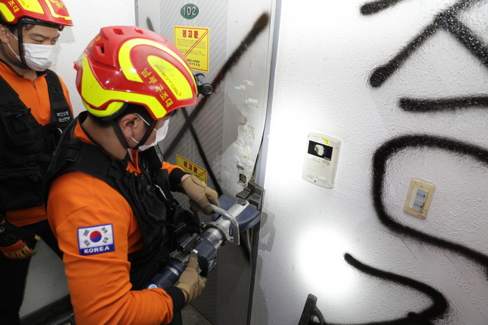 [ 로컬세계 부산=맹화찬 기자 ]부산 남부소방서(서장 정영덕)는 지난 4일 수영구 광안동 소재 재개발 지역에서 구조대원들이 방화문 개방 훈련을 실시했다고 7일 밝혔다.