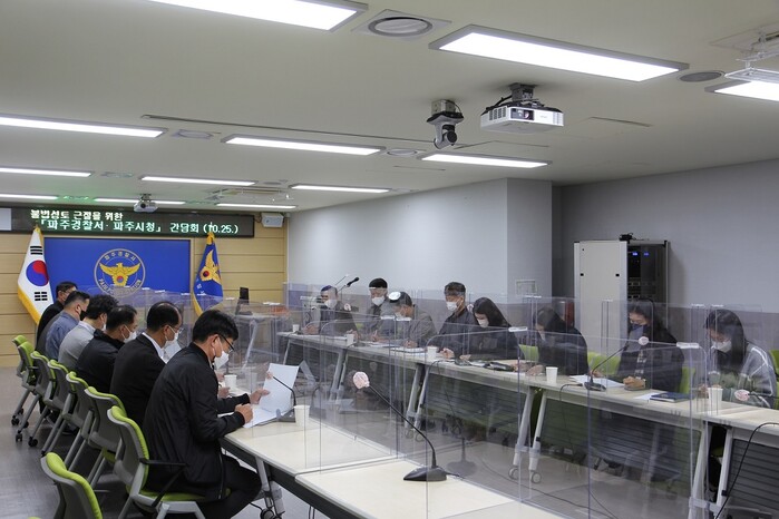 파주시에서는 감사관, 산림농지과, 자원순환과가 참석하고 경찰서에서는 수사과장, 수사팀장 등이 참석해 불법 농지 성토 행위자의 강력한 사법처리를 위한 상호협력방안을 논의했다.