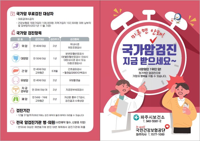 [로컬세계 = 이영원 기자]경기 파주시는 2022년도 국가암검진 대상자가 암 검진을 받도록 적극 독려함으로써 수검률을 높이기 위해 오는 8월 31일까지 ‘1(국가 암검진)+1(기프티콘) 챙겨’ 이벤트를 진행한다고 밝혔다.
