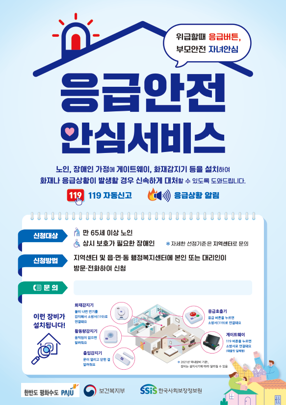 독거노인·장애인 응급안전안심서비스는 만 65세 이상의 국민기초생활수급자, 차상위계층의 독거노인과 장애인활동지원수급자 중 상시 보호가 필요한 가정에 가스·화재·활동감지기 등을 설치하고 최신 ICT(정보통신기술)를 활용한 모니터링을 통해 응급상황 시 소방서로 신고하는 서비스다.
