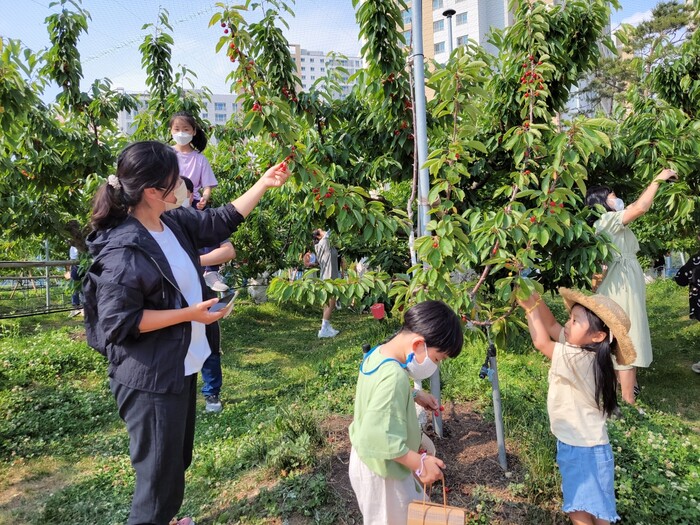 ▲수원시 과수공원에서 체리체험을 하고 있는 어린이들. 수원시 제공 |
