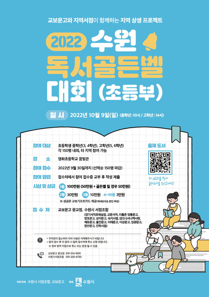 수원시 서점 조합과 교보문고 광교점이 공동 주최하고 수원시가 후원하는 ‘2022 수원 독서골든벨’은 10월 9일 영화초등학교 꿈빛관에서 열린다. 초등학생 중학년(3·4학년)이 오전 10시, 고학년(5·6학년)은 오후 2시 시작된다.