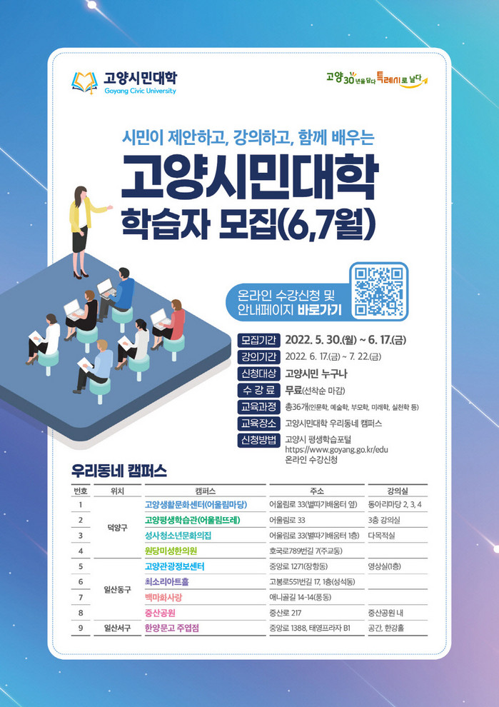 [로컬세계 이영원 기자]경기 고양시가 오는 30일부터 6월 17일까지 2022년 고양시민대학 1기 학습자를 모집한다.