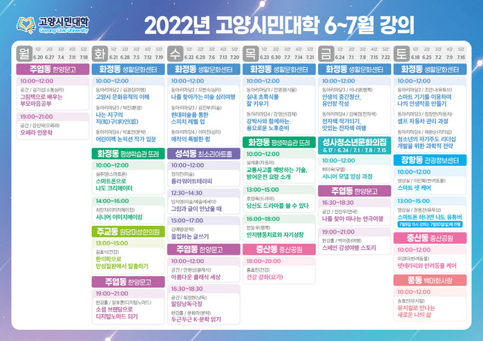 강의는 ▲어울림누리 고양생활문화센터 ▲고양평생학습관 어울림뜨레 ▲성사청소년문화의집 ▲고양관광정보센터 ▲최소리아트홀 ▲중산공원 ▲백마화사랑 ▲한양문고 주엽점 등 9개소에서 운영된다.