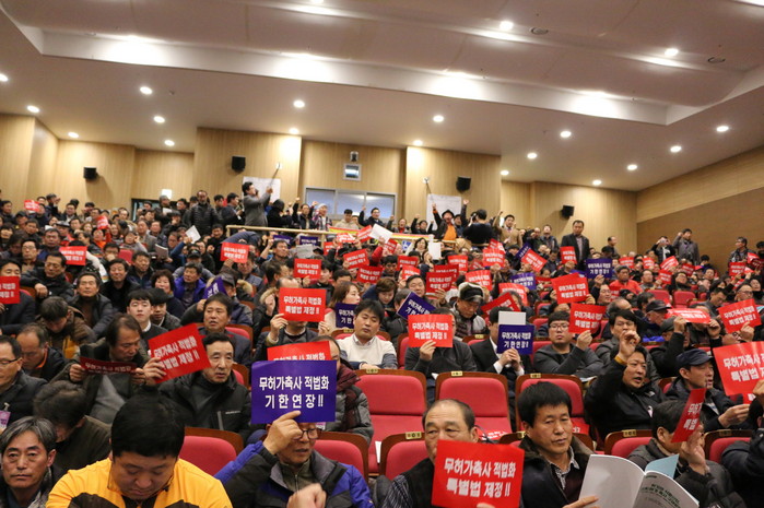 ▲국회에 모인 성난 농민들, 19일 국회의원회관 대회의실에서 열린 ‘미허가 축사 적법화 토론회’에 참석한 농민들이 미허가 축사 적법화 기한연장과 특별법 제정을 위한 구호를 외치고 있다. 이 날 진행된 토론회에는 전국에서 모인 1천여명의 축산농민을 비롯해 각 축산단체, 농림축산식품부, 환경부, 국토교통부, 지자체 관계자들이 모여 이에 대한 열띤 논의를 벌이는 한편, 축사 적법화 적용기간을 유예해 줄 것을 촉구했다. |