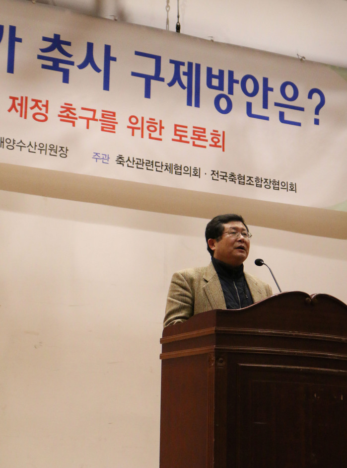 ▲무허가 축사 기한 연장 국회서 반드시 관철시킬 것!, 19일 국회의원회관 대회의실에서 열린 ‘미허가 축사 적법화 토론회’에 참여한 설훈 국회 농림축산식품해양수산위원회 위원장이 기조연설을 하고 있다. 이 날 설훈 농해수위원장은 무허가 축사 문제에 미온적 태도를 보이고 있는 농식품부를 지적하는 한편, 국회차원에서 참석한 농민들에게 무허가 축사 적법화 기한 연장을 약속했다. |