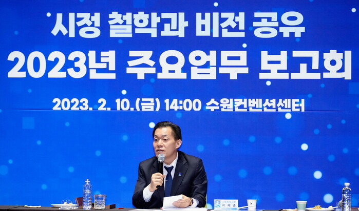 | ▲ 이재준 수원특례시장이 ‘2023년 주요업무 보고회’에서 발언하고 있다. 수원시 제공 |