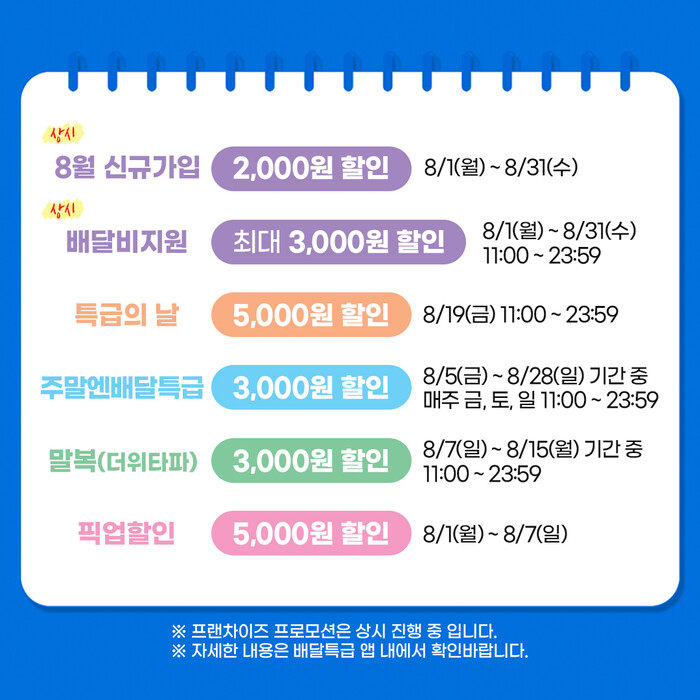 이에 오는 8월에는 ▲5,000원 할인쿠폰을 제공하는‘고양 특급의 날’ ▲배달비 지원 ▲3,000원 쿠폰을 제공하는 ‘주말엔 배달특급’▲휴가철 픽업 이벤트 ▲말복 더위타파 프로모션(8/7~8/15)등 풍족한 할인 혜택을 제공할 예정이다.