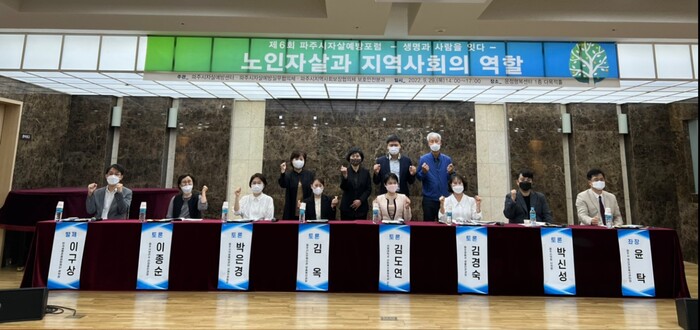 이어진 패널 토론에는(토론자 가나다순) 김경숙 파주경찰서 생활안전과장, 김도연 서영대학교 사회복지행정과 교수, 김옥 파주시노인복지관 맞춤복지과장, 박신성 파주시의회 의원, 박은경 파주시자살예방센터 팀장 등이 참여해, 지역사회 기관의 협력을 바탕으로 사회적 관심이 필요한 사안임을 인식하고 사회 안전망 구축 방안 등을 논의했다.