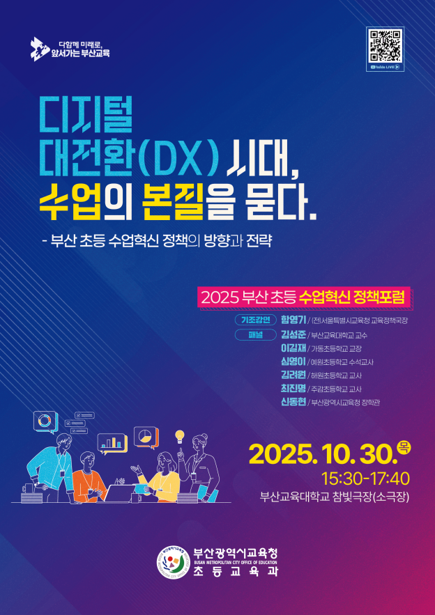 [로컬세계 = 맹화찬 기자] 부산광역시교육청은 오는 30일 오후 부산교육대학교 참빛극장에서 초등 교원과 교육전문직원 등 200여 명을 대상으로 ‘디지털 대전환(DX) 시대, 수업의 본질을 묻다’를 슬로건으로 ‘2025 부산 초등 수업혁신 정책포럼’을 개최한다고 27일 밝혔다.