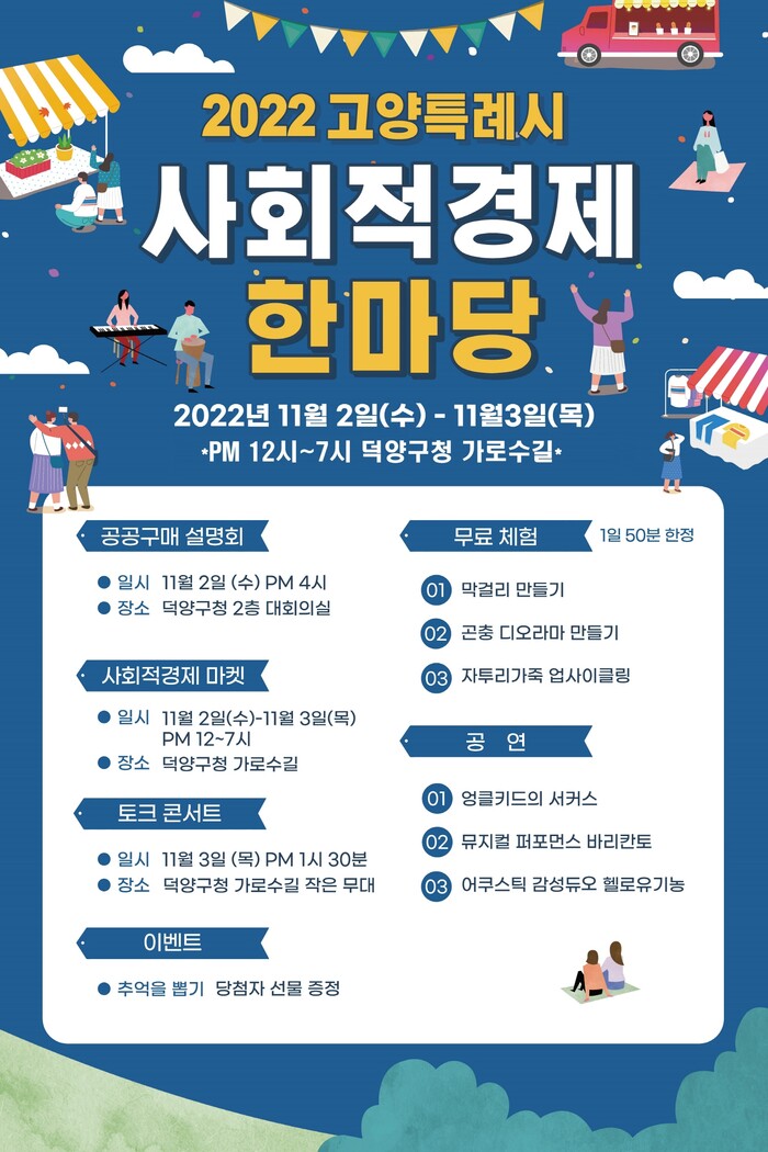 [로컬세계 = 이영원 기자]경기 고양특례시는 오는 11월 2일부터 11월 3일까지 고양시 덕양구청 일원에서 공공구매 설명회를 비롯해 사회적경제 마켓, 토크쇼 등 사회적경제 제품 및 서비스를 알리는 ‘2022 고양특례시 사회적경제 한마당’을 개최한다고 31일 밝혔다.